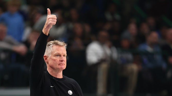DALLAS, TEXAS - JANUARY 22: Head coach Steve Kerr of the Golden State Warriors reacts during the first half against the Dallas Mavericks at American Airlines Center on January 22, 2026 in Dallas, Texas. (Photo by Sam Hodde/Getty Images)