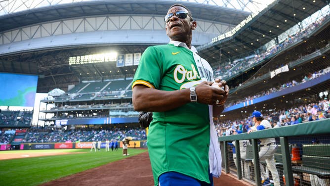 Hall of Famer Rickey Henderson after throwing out the ceremonial first pitch before the game between the Seattle Mariners and the Oakland Athletics at T-Mobile Park. (Steven Bisig-Imagn Images)