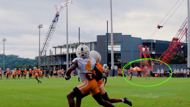 Tennessee's social media team took the time to edit this video and blur out the quarterback – likely at the request of someone on the coaching staff – to hide the signal caller's identity on a simple underthrown ball that was picked off on the practice field in early August.
