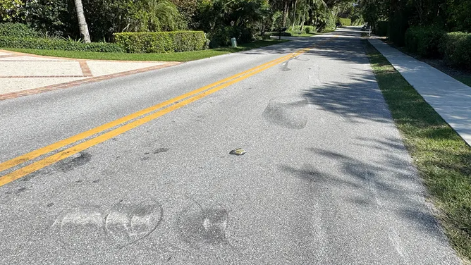 Tire marks could be seen in the area where the crash that Tiger Woods was reportedly involved in. (Fox News Digital)