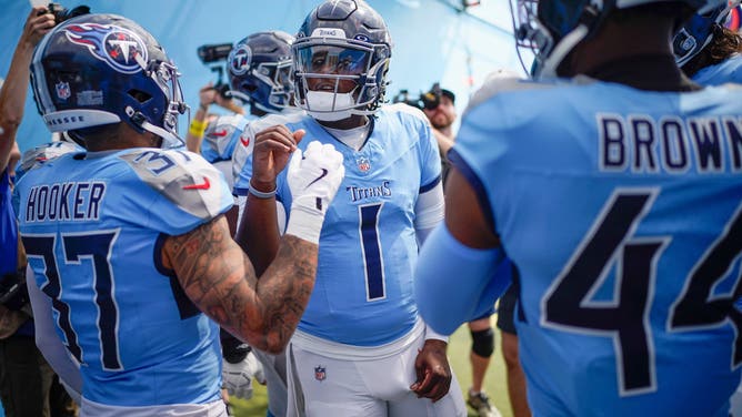 Tennessee Titans quarterback Cam Ward (1), safety Amani Hooker (37) and safety Mike Brown (44) talk before the game against the Indianapolis Colts at Nissan Stadium in Nashville, Tenn., Sunday, Sept. 21, 2025.