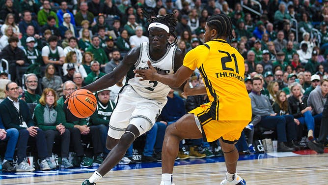 DETROIT - Kur Teng #2 of the Michigan State Spartans goes to the basket against Khoi Thurmon #21 of the Oakland Golden Grizzlies during the first half at Little Caesars Arena on December 20, 2025. (Photo by Aaron J. Thornton/Getty Images)