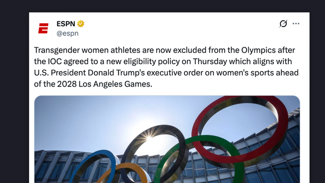 ESPN immediately took issue with the IOC's announcement on Thursday by sharing a post on X, predictably mentioning President Trump, while also stating "transgender women athletes are now excluded from the Olympics."