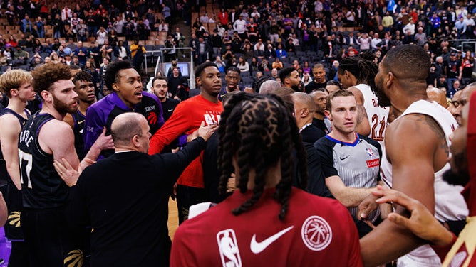 TORONTO, CANADA - FEBRUARY 12: Tristan Thompson #13 of the Cleveland Cavaliers gets into a scuffle with players of the Toronto Raptors at the end of their NBA game at Scotiabank Arena on February 12, 2025 in Toronto, Canada. (Photo by Cole Burston/Getty Images)