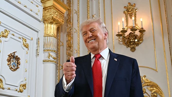 President Donald Trump gives a thumbs up as he arrives at a dedication ceremony for Southern Boulevard, in the ballroom at Mar-a-Lago. (Photo by ANDREW CABALLERO-REYNOLDS / AFP via Getty Images)