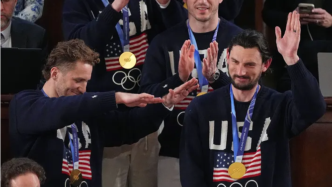 Members of the United States' Olympic hockey team attend as President Donald Trump delivers the State of the Union address to a joint session of Congress in the House chamber at the U.S. Capitol in Washington, Tuesday, Feb. 24, 2026. (AP Photo/Matt Rourke)