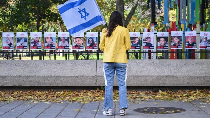 A woman looks at photographs of victims and hostages during a vigil outside McGill University in Montreal, Quebec, Canada on October 7, 2024, to commemorate the victims of the Oct. 7 attack by Hamas on Israel. With candles, prayers and music, commemorations for the October 7 attack began in Israel's Tel Aviv on October 6 at a ceremony to mark the first anniversary of the Hamas onslaught at the Nova music festival. The anniversary comes with Israel engaged in a fresh war in Lebanon against Hezbollah and preparing to retaliate against Tehran, raising fears of an even wider conflict. (Photo by Graham Hughes / AFP) (Photo by GRAHAM HUGHES/AFP via Getty Images)