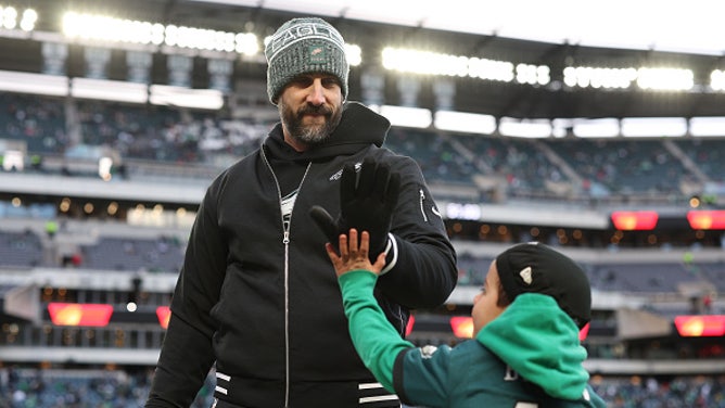 PHILADELPHIA, PENNSYLVANIA - JANUARY 11: Head coach Nick Sirianni of the Philadelphia Eagles and his son, Jacob, take a photo before the NFC Wild Card Playoff game against the San Francisco 49ers at Lincoln Financial Field on January 11, 2026 in Philadelphia, Pennsylvania. (Photo by Elsa/Getty Images)