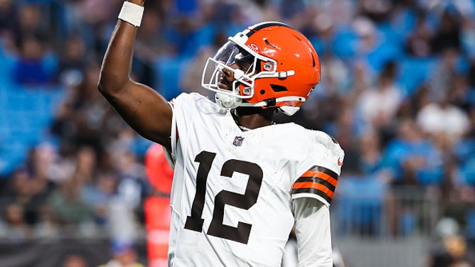 CHARLOTTE, NORTH CAROLINA - AUGUST 08: Shedeur Sanders #12 of the Cleveland Browns reacts after a touchdown during the 1st half of an NFL Preseason 2025 game against the Carolina Panthers at Bank of America Stadium on August 08, 2025 in Charlotte, North Carolina. (Photo by David Jensen/Getty Images)