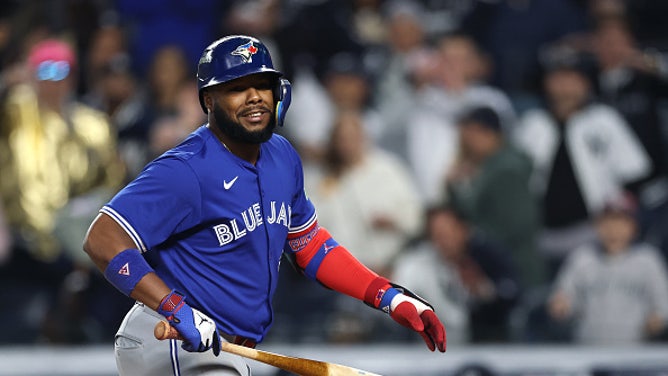 NEW YORK, NEW YORK - OCTOBER 08: Vladimir Guerrero Jr. #27 of the Toronto Blue Jays reacts after striking out during the fifth inning against the New York Yankees in game four of the American League Division Series at Yankee Stadium on October 08, 2025 in New York City. (Photo by Ishika Samant/Getty Images)