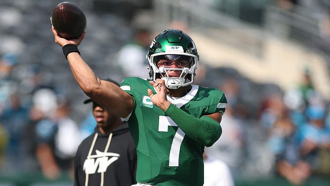 EAST RUTHERFORD, NEW JERSEY - OCTOBER 19: Justin Fields #7 of the New York Jets warms up prior to the game against the Carolina Panthers at MetLife Stadium on October 19, 2025 in East Rutherford, New Jersey. (Photo by Ishika Samant/Getty Images)