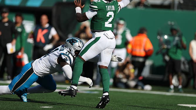 EAST RUTHERFORD, NEW JERSEY - OCTOBER 19: Tyrod Taylor #2 of the New York Jets is hit by Nic Scourton #11 of the Carolina Panthers as he throws a pass during the second half in the game at MetLife Stadium on October 19, 2025 in East Rutherford, New Jersey. (Photo by Al Bello/Getty Images)