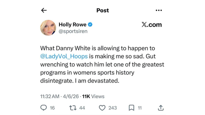 "What Danny White is allowing to happen to @LadyVol_Hoops is making me so sad," Rowe wrote in a now-deleted post on X. "Gut wrenching to watch him let one of the greatest programs in women's sports history disintegrate. I am devastated."