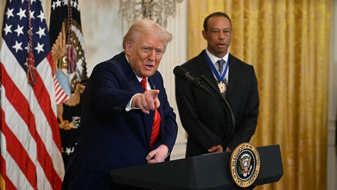 US President Donald Trump speaks next to golfing legend Tiger Woods during a reception for Black History Month in the East Room of the White House on February 20, 2025, in Washington, DC. (Photo by Jim WATSON / AFP) (Photo by JIM WATSON/AFP via Getty Images)