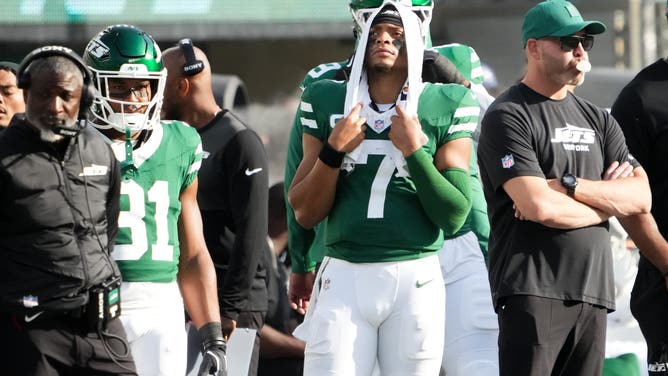 Oct 19, 2025; East Rutherford, New Jersey, USA; New York Jets quarterback Justin Fields (7) reacts in the fourth quarter against the Carolina Panthers at MetLife Stadium. Mandatory Credit: Robert Deutsch-Imagn Images